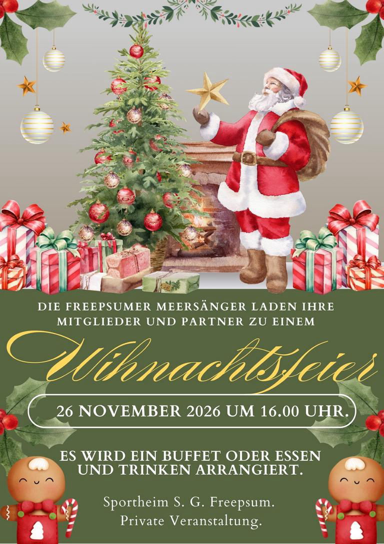 Zu unserer diesjährigen Weihnachtsfeier am 26. November 2026 ab 16:00 Uhr sind die Freepsumer Meersänger nebst Partnern aufs Herzlichste eingeladen.