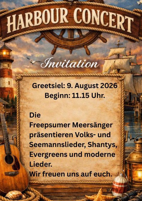 Am 9. August 2026 ab 11:15 Uhr ist es wieder soweit. Wir freuen uns, euch einzuladen auf unser Hafenkonzert in Greetsiel. Das Hafenkonzert ist ein touristisches Sommerhighlight und findet direkt an der Hafenkante von Greetsiel statt. Unter schönem Wetter und mit kostenlosem Eintritt werden die Freepsumer Meersänger eigens komponierte Lieder singen, sowie bekannte Shantys, Seemannslieder und Evergreens und unser Publikum unterhalten.